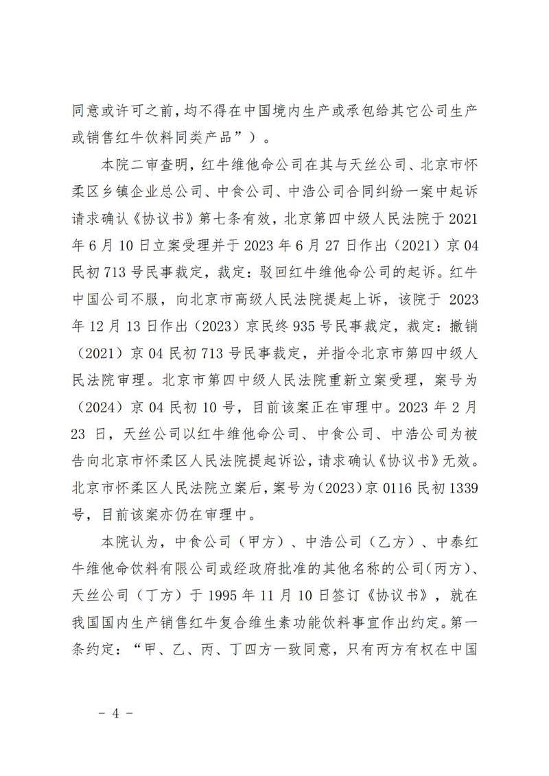此前,红牛维他命饮料有限公司(以下简称“合资公司”)起诉天丝医药保健有限公司(以下简称“天丝公司”)、中国食品工业(集团)有限公司(以下简称“中食公司”)和深圳中浩(集团)股份有限公司(以下简称“中浩公司”),主张确认 1995 年 11 月10 日中食公司、中浩公司、中泰红牛维他命饮料有限公司、天丝公司共同签订的《协议书》(也即华彬集团主张的“50年协议”)第一条有效,即在合同有效期内“只有红牛维他命公司有权在中国境内生产销售红牛饮料。中食公司、中浩公司在没有得到红牛维他命公司和天丝公司书面同意或许可之前均不得在中国境内生产或承包给其他公司生产或销售红牛饮料系列产品。红牛维他命公司和天丝公司未得到中食公司和中浩公司书面同意或者许可之前及均不得在中国境内生产或承包给其他公司生产或销售红牛饮料同类产品”的约定有效。广东省深圳前海合作区人民法院(2019)粤 0391民初 725 号民事判决支持该诉求,但此次广东省深圳市中级人民法院(2023)粤 03 民终 11482 号裁定深圳前海法院在作出一审判决时程序存在错误,依法撤销前海法院判决,并将案件发回重审。